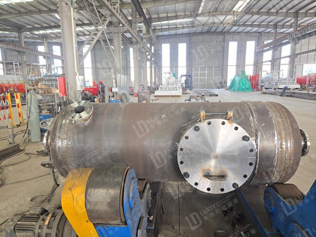 在制造過程中,項(xiàng)目團(tuán)隊(duì)嚴(yán)格執(zhí)行相關(guān)技術(shù)規(guī)范和質(zhì)量控制要求,從原材料檢驗(yàn)、筒體成型到焊接組對,每一道工序均進(jìn)行全過程把控。設(shè)備主體采用臥式結(jié)構(gòu),整體布局合理,法蘭接口、人孔及工藝開口設(shè)置科學(xué),既滿足工藝運(yùn)行需求,也便于后期檢修與維護(hù)。焊接工藝成熟穩(wěn)定,焊縫質(zhì)量可靠,為設(shè)備長期穩(wěn)定運(yùn)行提供了有力保障。