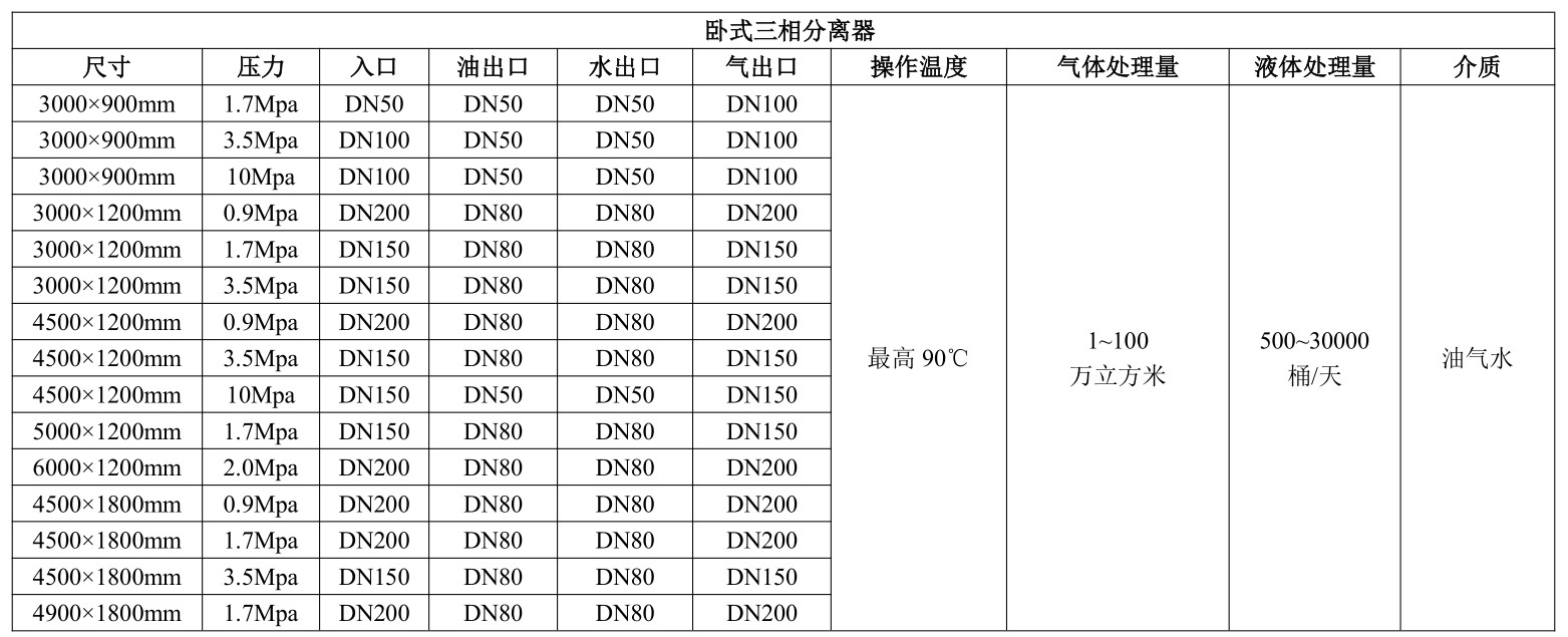 按照形態(tài)來分,油氣水三相分離器一般分為臥式和立式,臥式分離器通常用于較大的液/氣比流體的處理,或液/液分離。與立式分離器相比,臥式分離器的液體流動(dòng)的水平截面積較大,不同密度液體的重力分離的垂直段較短。目前國(guó)內(nèi)常用的的形態(tài)為臥式分離器。